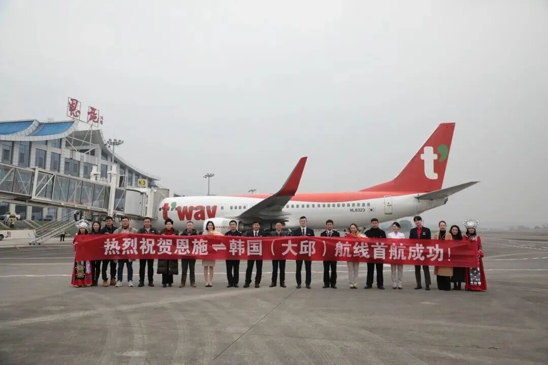 12月2日12:02,由韩国德威航空执飞的TW697航班平稳降落在恩施许家坪国际机场。这标志着恩施⇌大邱国际直飞航线首航成功,该航线采用波音737-800机型执飞,12月共计执行七班往返航班。