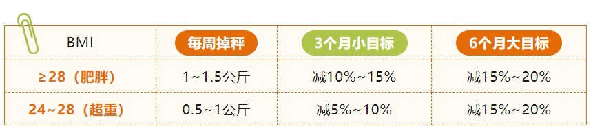 ▶ 如果你已经超重(BMI 24~28),3个月先减掉体重的5%~10%,比如70公斤的人先减3.5~7公斤。