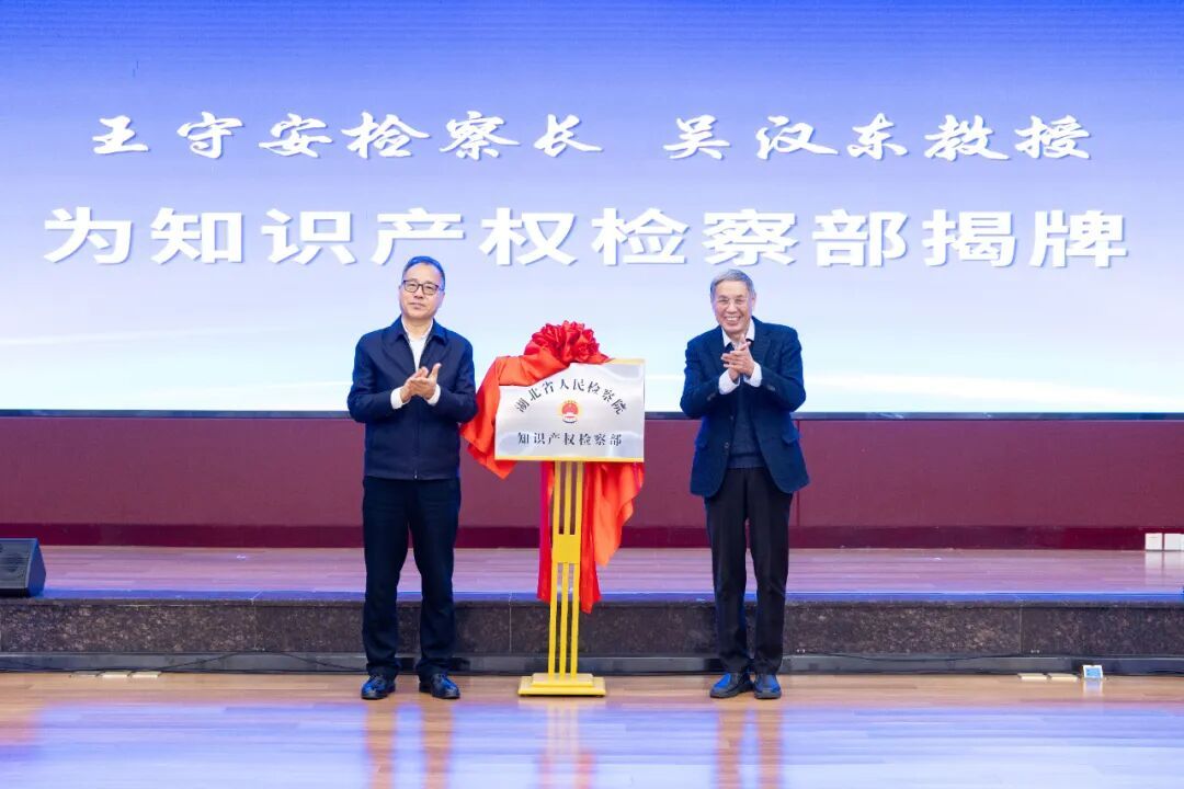 12月4日,湖北省人民检察院举办“推进湖北知识产权检察工作座谈会暨知识产权检察部挂牌仪式”。省检察院党组书记、检察长王守安与中南财经政法大学资深教授吴汉东教授共同为省检察院知识产权检察部揭牌。会议由省检察院党组副书记、常务副检察长金鑫主持。