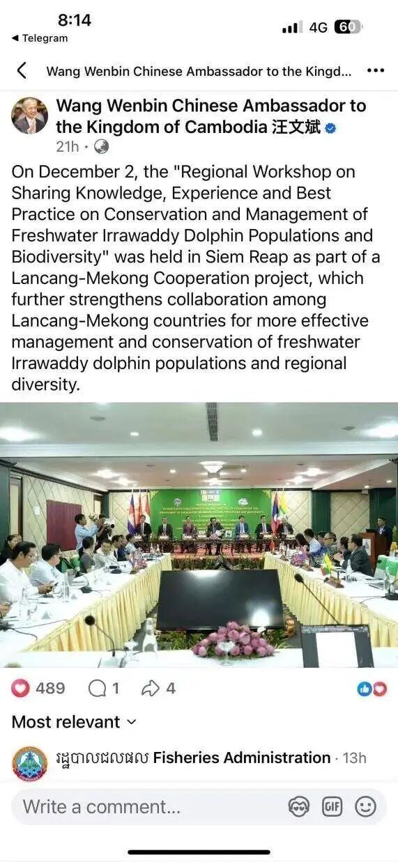 近日,澜湄合作专项基金支持的“伊洛瓦底江豚保护与生物多样性管理区域研讨会”在柬埔寨暹粒落幕,会上传来喜讯:得益于中国长江江豚保护经验的推广应用,柬埔寨境内极度濒危的伊洛瓦底江豚种群实现稳步恢复,2025年新增8头新生幼豚,且全年未发生一起江豚死亡案例。中国驻柬埔寨大使汪文斌也为这一澜湄生态合作成果点赞。