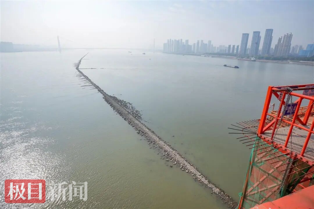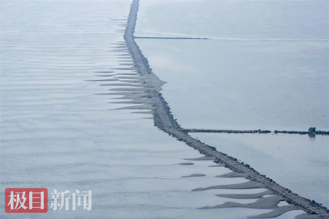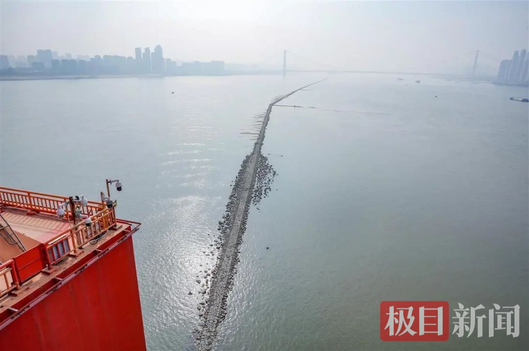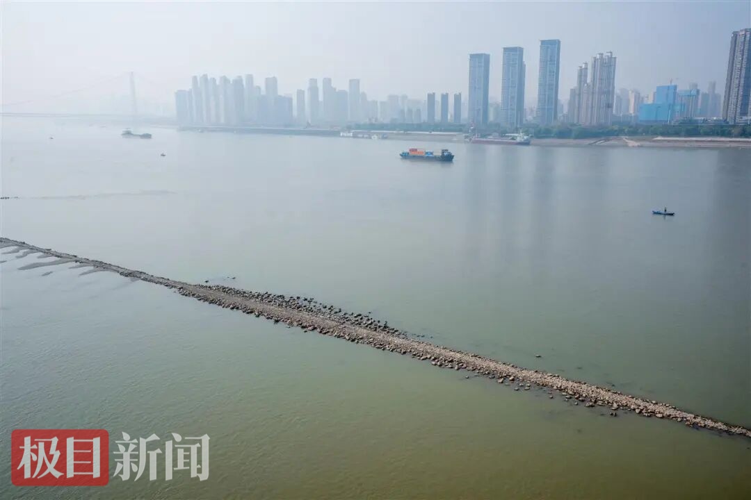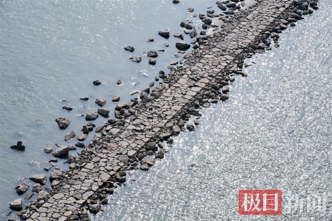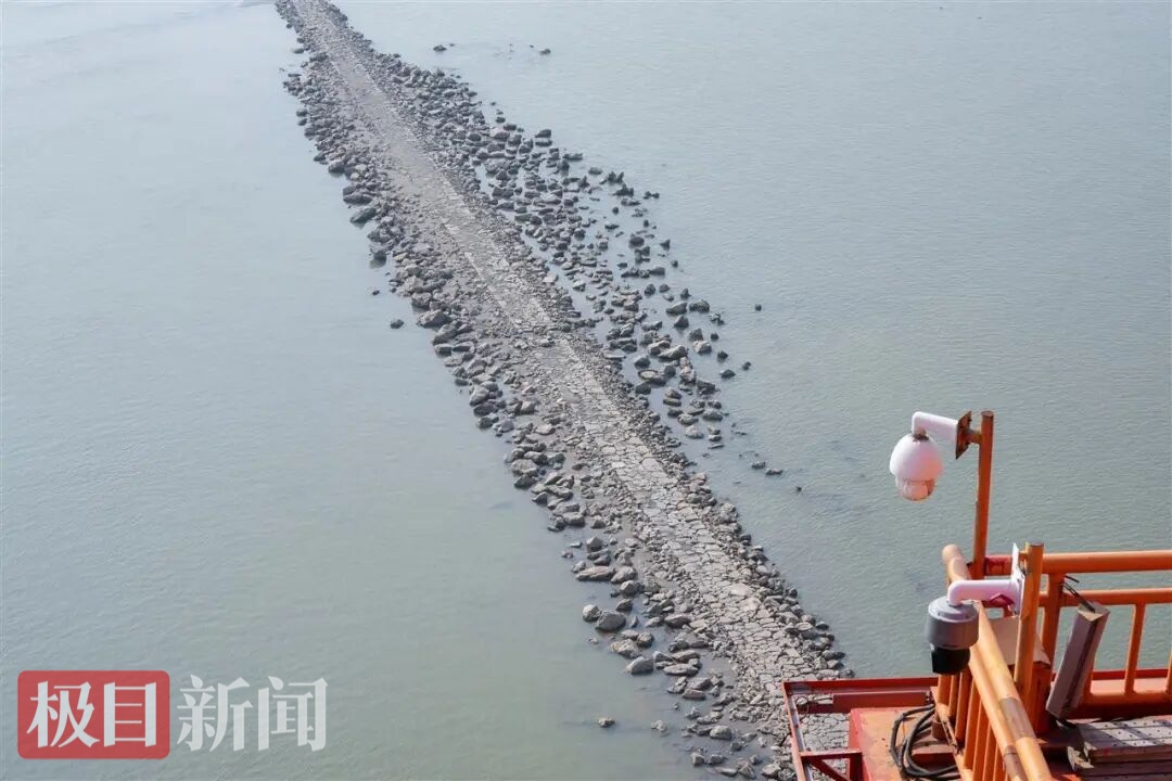 据了解,这条“江心小路”并非天然形成的通道,而是名为“丁字坝”的水文设施,在鹦鹉洲长江大桥修建时同期建设。其核心作用是引导江水集中流向主航道,保障船舶航行安全,通常仅在冬季枯水期水位低于15米时才会完整露出水面。