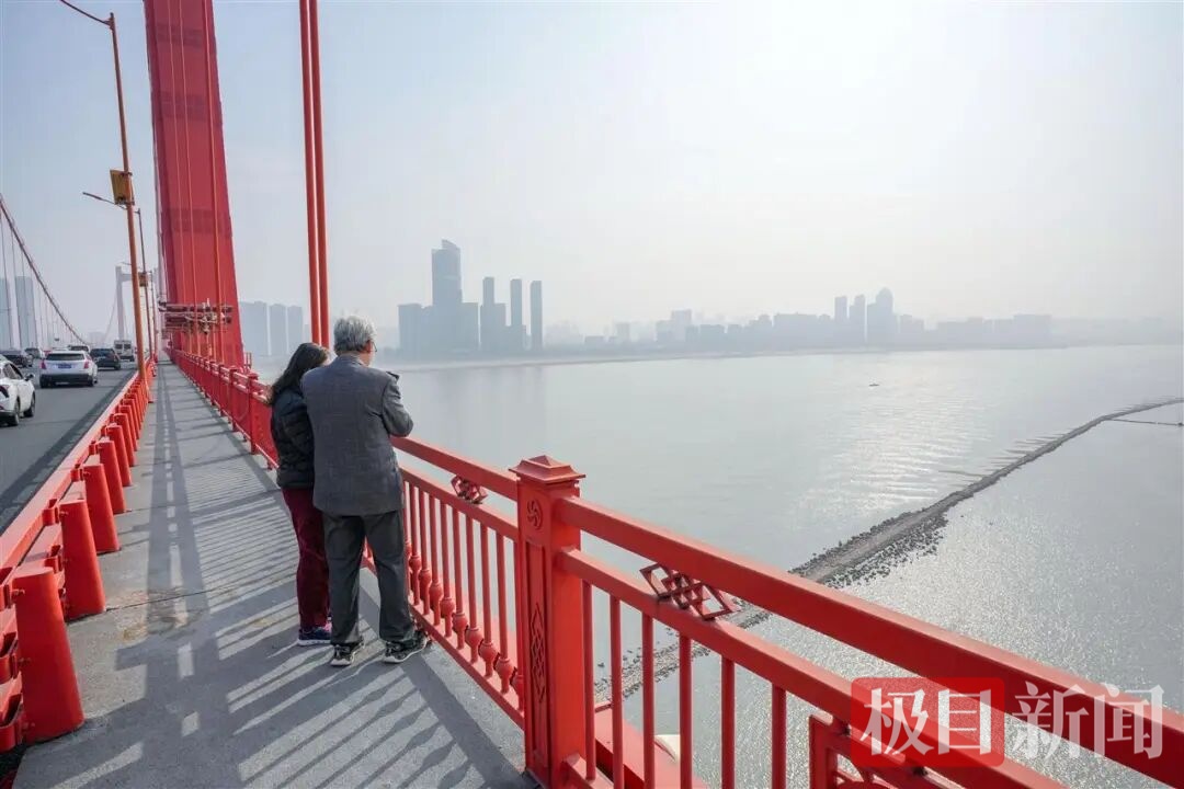 12月7日,记者前往鹦鹉洲长江大桥探访。在桥面人行道上可清晰看到,这条“小路”起点位于鹦鹉洲长江大桥2号主塔附近,绵延至杨泗港大桥方向,部分路段两侧的石头已露出水面。冬日暖阳下,“小路”两侧江水波光粼粼,“小路”宛如一条长龙横卧江面,吸引不少过往行人驻足拍照留念。