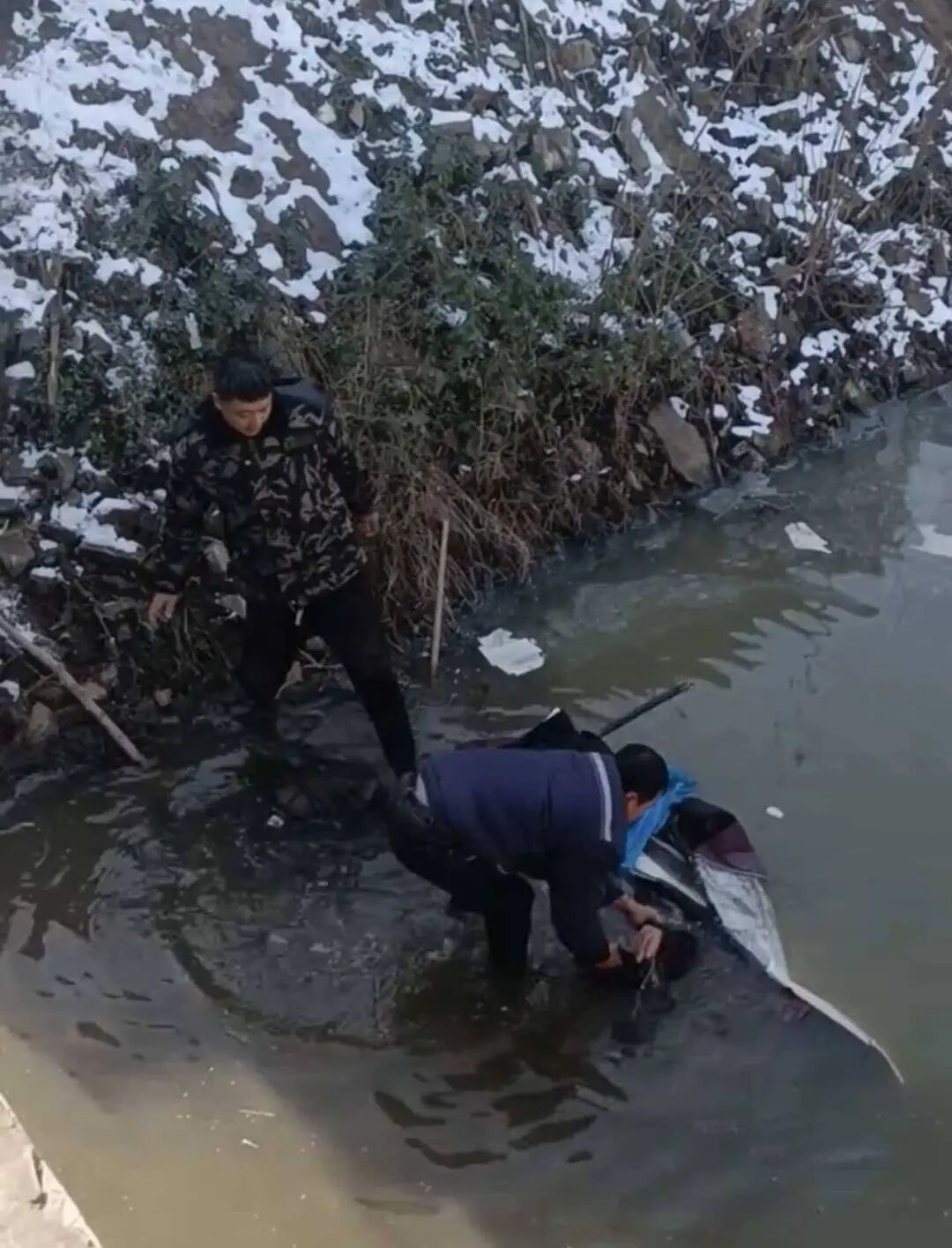 山东曹县侯集镇一女子骑电动车冲进河里沉没,两男子踏雪下水摸到人后,众人合力将她抬上岸,其中两男子还轮流按压为其做心肺复苏,成功施救。16日上午,侯集镇人民政府工作人员告诉极目新闻记者,镇里正在为他们申报见义勇为。