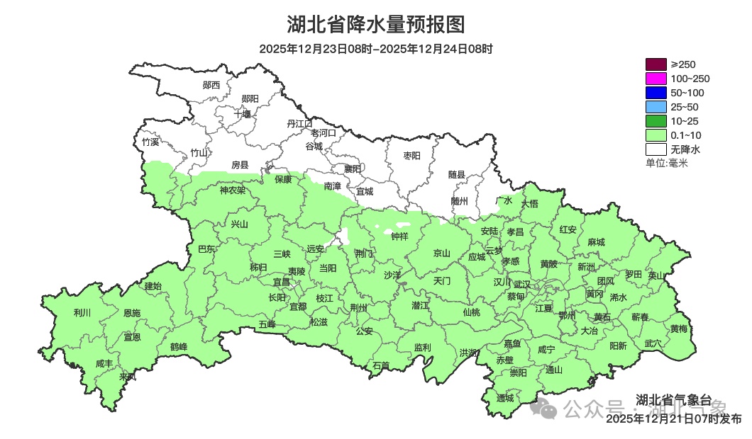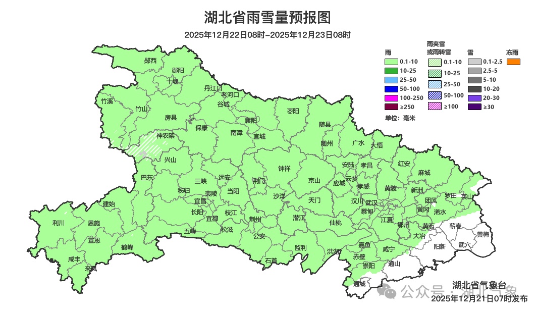 12月21日08时-22日08时,全省阴天转多云,其中鄂西北、鄂西南局地有小雨,高山地区有雨夹雪或雪。上午省内局地有雾。最高气温7~13℃,最低气温鄂西北1~4℃、其他地区4~7℃,偏东风2到3级。