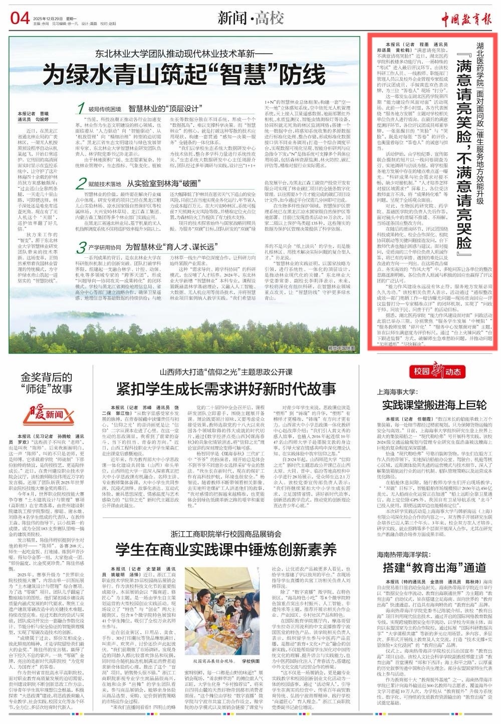 2025年12月29日,《中国教育报》04版刊发报道《满意请亮笑脸,不满意请亮哭脸》,报道了湖北医药学院通过“面对面问政”破解师生急难愁盼问题,催生服务地方效能升级。一起来看——