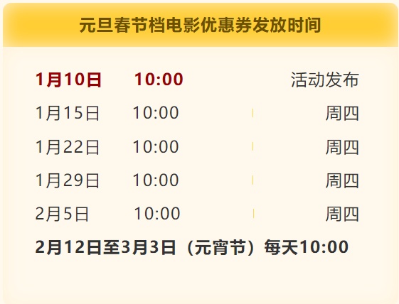 分为元旦春节档、五一档、暑期档、国庆档等重要节假日档期发放。