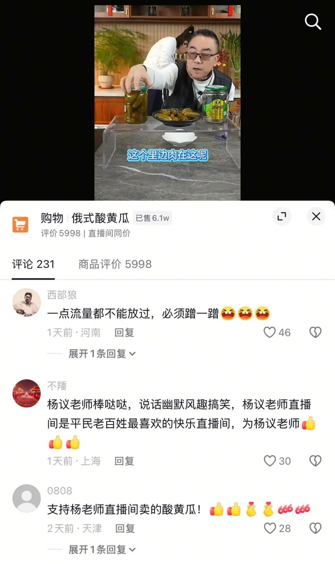 有网友认为,杨议带货酸黄瓜,是蹭演员闫学晶“酸黄瓜”事件的流量。有人评论称“抓住商机了”,也有人表示对带货酸黄瓜表示支持。