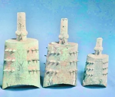 3件西周青铜器——铜甬钟在中国展区的第三个专柜陈列,它们于1958年在湖北钟祥花山水库窖藏出土。