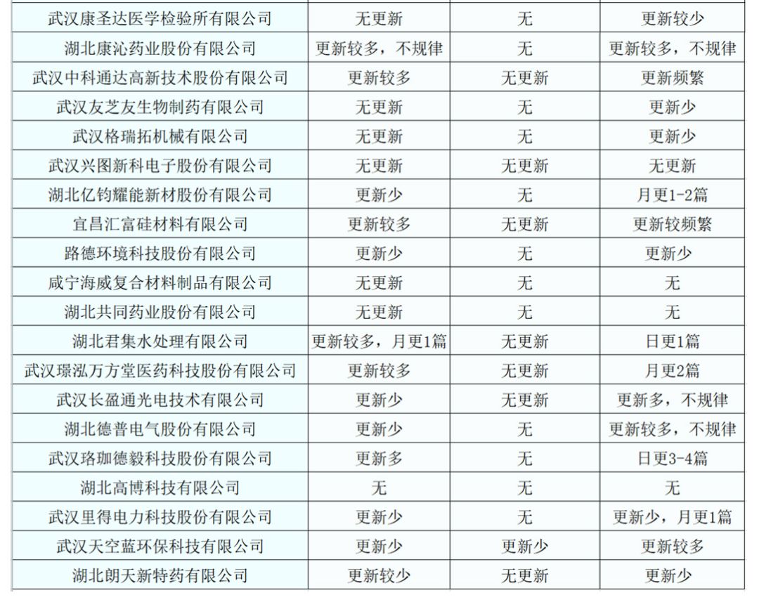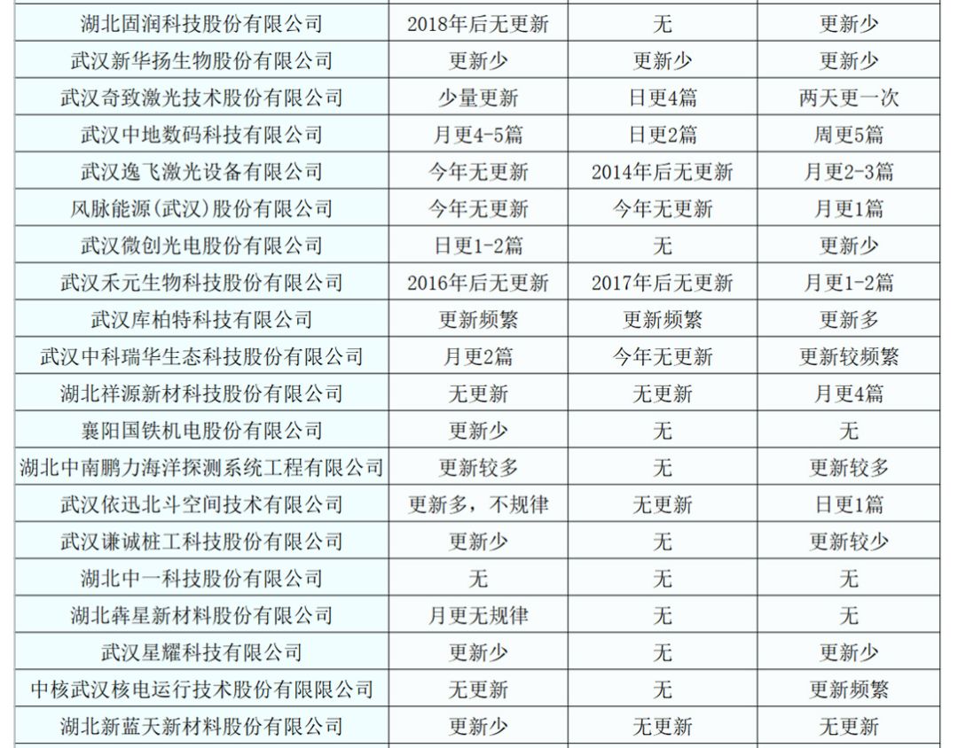 立得空间信息技术股份有限公司、武汉璟泓万方堂医药科技股份有限公司等,更注重官方网站的维护。他们日更新量有时能达到日均两篇。