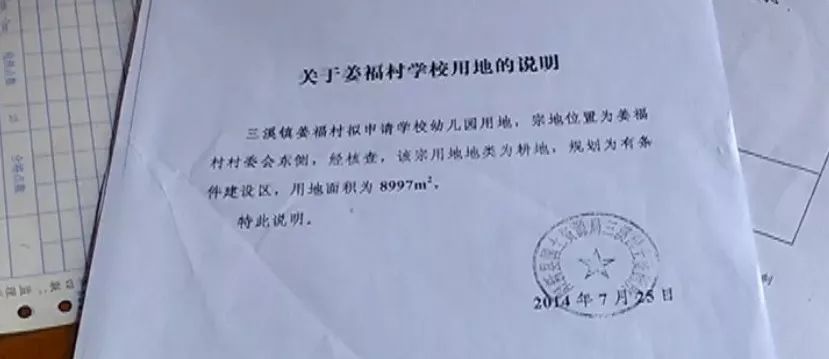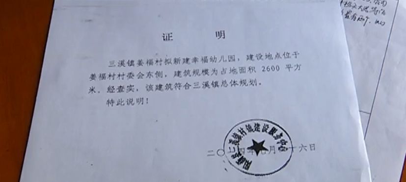在一大堆签字“同意”的申请表中,记者发现,在土地审批手续中,幼儿园仅提供了由三溪镇国土资源所出具的《关于姜福村学校用地的说明》和由三溪镇村镇建设服务中心盖章的晨光幼儿园建筑符合三溪镇总体规划的证明。