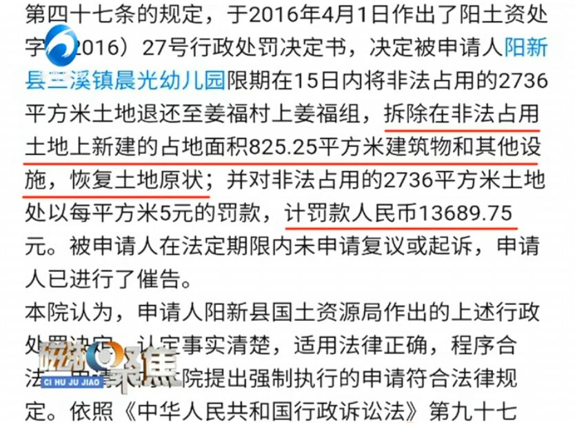 从阳新县国土资源监察大队提供的一份2016年11月23号,阳新县人民法院作出的《阳新县国土资源局与阳新县三溪镇晨光幼儿园一案行政裁决书》中得知,晨光幼儿园非法侵占了姜福村上姜福组土地2736平方米。法院裁定:拆除在非法占用土地上新建的占地面积825.25平方米建筑物和其他设施,恢复土地原状,并罚款13689.75元。这份裁决书最后强调,行政处罚决定,准予强制执行。由申请人阳新县国土资源局组织实施。
