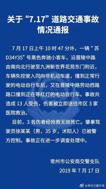 据常州市公安局交警支队17日1时许发布的通报,7月17日上午10时47分许,一辆“苏D34Y35”号黑色奔驰小客车,沿晋陵中路由南向北行驶至九洲新世界花苑东门附近,车辆失控驶入同向非机动车道,撞到正常行驶的电动自行车后,又在晋陵中路劳动西路路口撞到正在等红灯的电动自行车。事故共造成13人受伤,伤者被立即送往市区3家医院救治。目前,3名伤者经抢救无效死亡。肇事驾驶员徐某某(男,35岁,沭阳人)已被警方控制。事故正在进一步调查处理中。