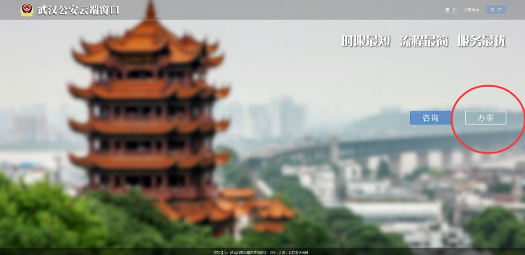 登录后,即显示“武汉公安云端窗口”页面,点击“办事”按钮