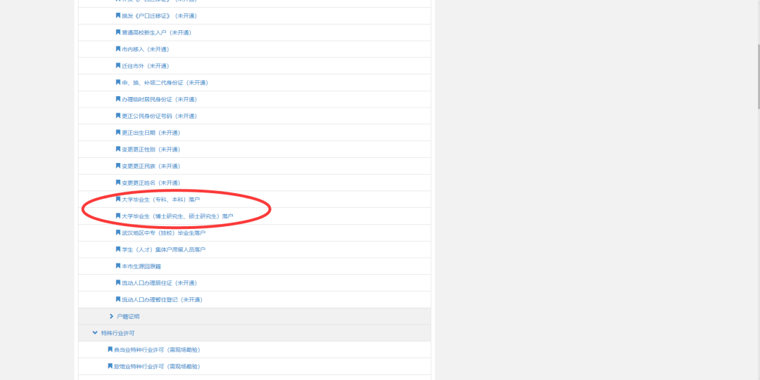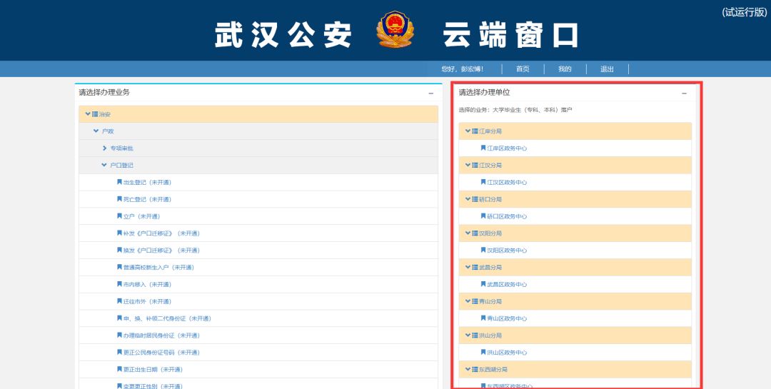 并在右侧页面选择拟落户地的管辖单位(如在武昌区落户就选择“武昌分局”),选择后即可根据个人情况选择具体的办理情形,依照提示上传图片、提交资料,即可完成业务申请。