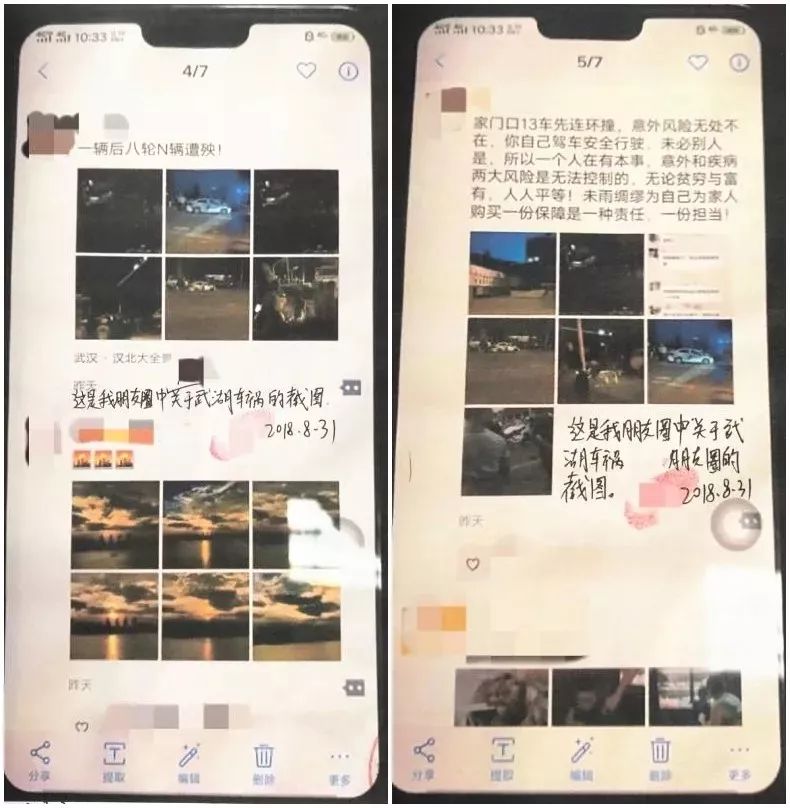 罗某交代,当天她在孝昌的家中带孩子,晚上刷朋友圈发现,自己以前在黄陂居住的小区附近发生车祸,邻居们还配发了车祸现场车辆撞损的图片。她就在朋友小李的朋友圈下留言评论,“地上有没有血?”对方回复称:“没有,听说死了7个人,有个小孩拿出来都是瘪的!听他们说的不知道真假。”