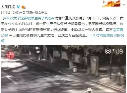 【#长沙女子深夜被陌生男子刺伤# 病情严重伤及卵巢】7月30日,湖南长沙一女子在公交车站打车时,遭一陌生男子从背后持锐器捅伤,男子随后逃离现场。被刺女子的主治医师称其病情严重,伤及卵巢、小肠以及一根大血管。警方@芙蓉公安 今日通报伤者目前无生命危险,已成立专案组调查。