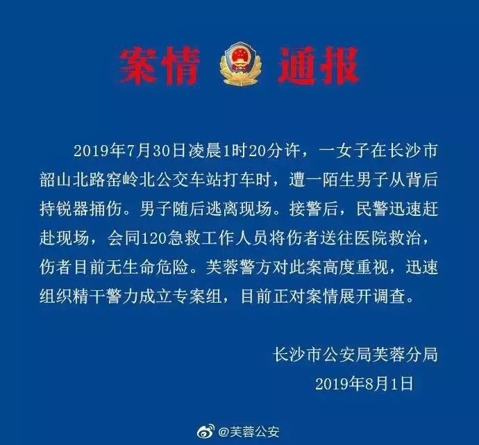 2019年7月30日凌晨1时20分许,一女子在长沙市韶山北路窑岭北公交车站打车时,遭一陌生男子从背后持锐器捅伤。男子随后逃离现场。接警后,民警迅速赶赴现场,会同120急救工作人员将伤者送往医院救治,伤者目前无生命危险。芙蓉警方对此案高度重视,迅速组织精干警力成立专案组,目前正对案情展开调查。