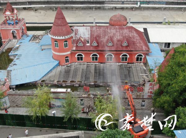 玫瑰宫位于百二河沿岸,燕林小区附近,是一座偏欧式的红房子,目前已将内部全部清空,按照项目规划,今天上午开始拆除工作。