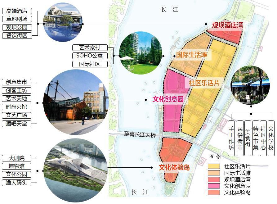 拟引进实力雄厚的开发主体,以建设大剧院和展览馆等文化设施为支点,引入创意集市、艺术天地、高端酒店、滨水娱乐等业态,整体打造国际性文化创意休闲“慢生活岛”和“坝上明珠”。