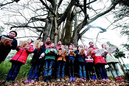 图为:支教老师带领学生来到校外课堂——八百岁的银杏树下诵读国学经典。