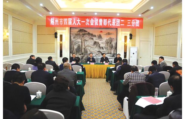 1月9日,代表们认真审议市人大常委会、市中级人民法院、市人民检察院工作报告。图为市委书记刘晓鸣(主席台左二)、市领导夏卫东(主席台右二)在曾都代表团二、三分团参加审议。 (本报记者 孙洪涛 摄)