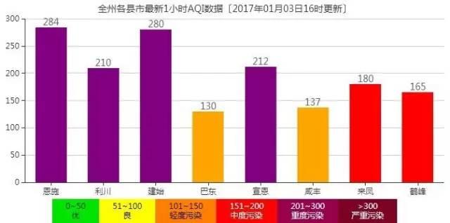 截止3日下午16时,恩施市、利川市、建始县、巴东县AQI指数处于重度污染状态。