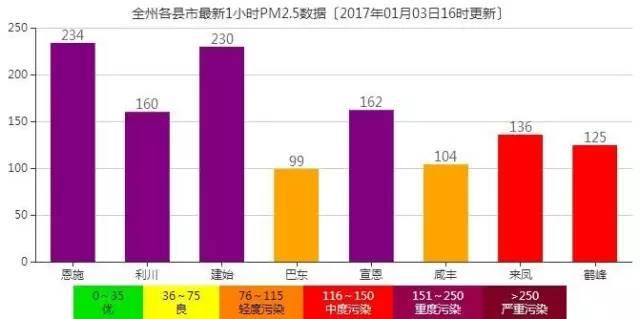 截止3日下午16时,恩施市、利川市、建始县、宣恩县PM2.5值也处于重度污染状态。