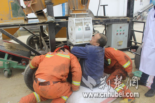 当天中午15时,一名50余岁的粮站工人右手手腕被卡在除杂质的筛分机器的出口里面,仙桃消防中队接到报警后,迅速出动1台抢险救援车、6名消防官兵赶赴现场。