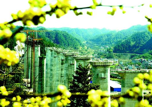 湖北日报(荆楚网)消息 昨日,来凤县革勒车镇黔张常铁路革勒特大桥建设工地。革勒特大桥全长827.2米,由11跨连续梁组成。黔张常铁路全长339公里,来凤段全长28.5公里,目前开工工点63个,占总工点64个的99%。 (视界网 姚丙然 摄)
