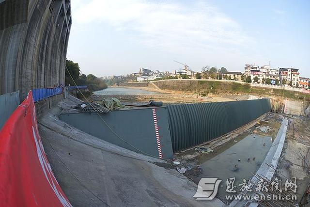 在钢板坝工程现场,记者看到,工人正在紧张施工,东门大桥下游的河水已通过围堰引入导流洞,河中央的钢板坝已具雏形。