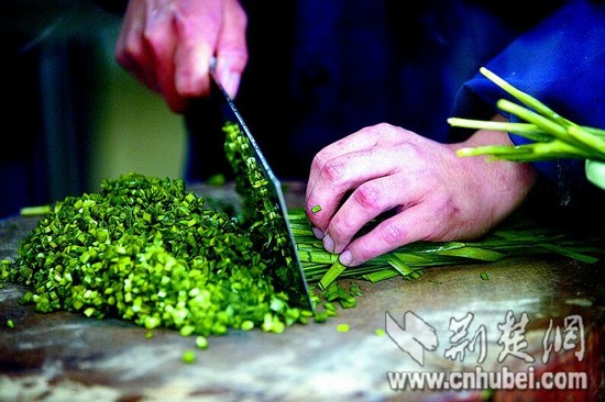 图为:将新鲜野芹菜、野韭菜切成沫。