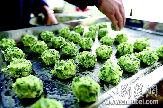 图为:混好野菜沫的鱼蓉捏制成丸子,再按扁成饼。