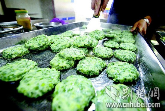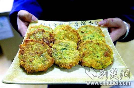 湖北日报讯 早春,野菜饼成为咸宁市百姓一道特色佳肴。制作野菜饼时,先取新鲜鱼肉打成鱼蓉,再将采摘的新鲜野芹菜、野韭菜等切成沫,加入鱼蓉混合搅匀,制成直径十厘米大小的小饼上蒸锅蒸,再裹上蛋黄煎至金黄,清香扑鼻。