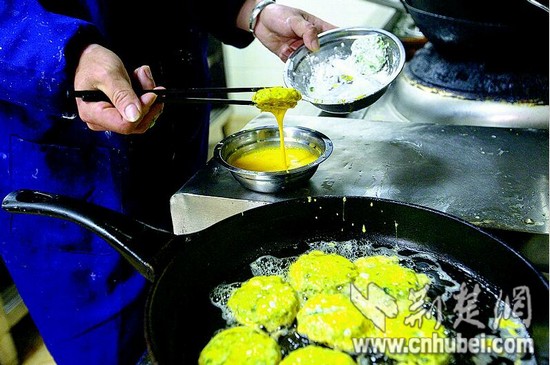 图为:野菜饼裹上一层蛋黄入油锅煎。