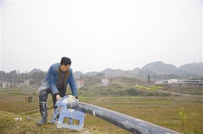3月21日,工人师傅在来凤县三胡乡安子村安装主水管。