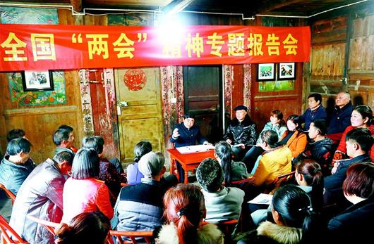 湖北日报讯 昨日,全国人大代表、被称为“愚公支书”的建始县龙坪乡店子坪村党支部书记王光国在家中为前来参加学习的党员干部举行全国“两会”精神专题报告会。他讲述了参会感受和学习体会。他表示,将撸起袖子加油干,带领村民推动产业结构转型升级,真正为百姓谋好致富路,力争2018年村民人均纯收入达到全省平均水平。(视界网 向阳 摄)