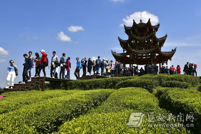 3月31日,游客在宣恩县伍家台贡茶文化旅游区的栈道上游玩。记者宋文摄