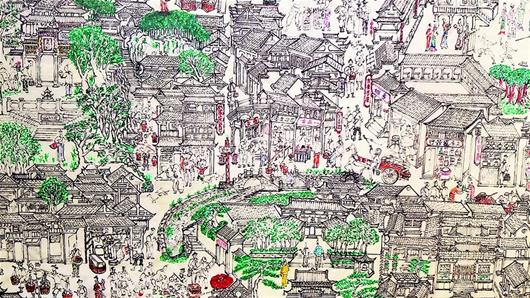 查阅县志、翻看历史文献资料、走访老城居民,到处搜寻和古城有关的图文资料。周学聪先画出小幅的草图,经过多方求证,各个细节无误之后再绘制到大图上。历时3年,终于圆满完工。