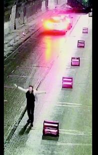 图为:向锐挥动双臂,向后面车辆示警。 (视频截图)