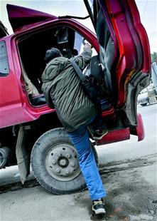 图为:3月11日,在恩施市马路边吃完午饭,何圣明艰难地爬上拉树苗的货车,继续赶往咸丰县丁寨乡。