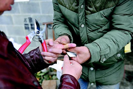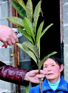 图为:村民徐金桥家中,何圣明叮嘱来这里领树苗的村民,移栽前一定要把顶端的嫩芽剪掉,保证成活率。