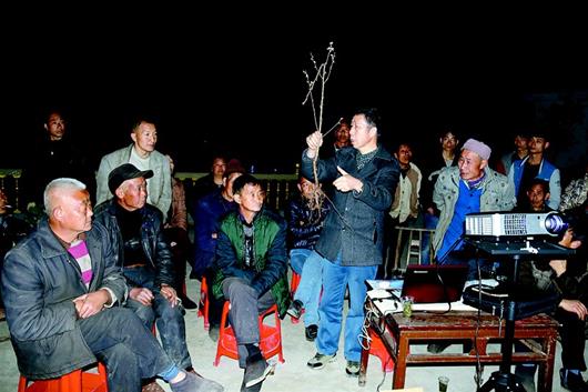 春耕时节,农民白天忙农活,何圣明就利用晚上,翻山越岭给大家讲技术。从选苗、移栽、水肥管理、整治修剪、病虫害防治到保花保果……每个环节,每亩地,甚至每户农家,他力求一一把关。