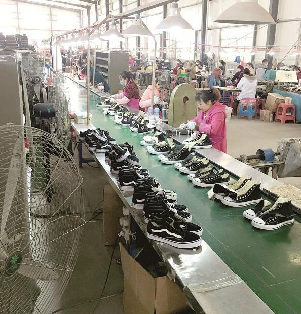 生产车间面积上千平方米,里面气味刺鼻,数台电风扇正呼呼转动,100多名工人十分忙碌:制作鞋底、印花、缝制鞋面、做鞋帮、固定鞋型、系鞋带、装盒……