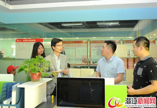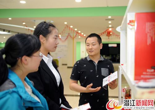 翼之虾总经理左泽愈(右一)介绍公司产品