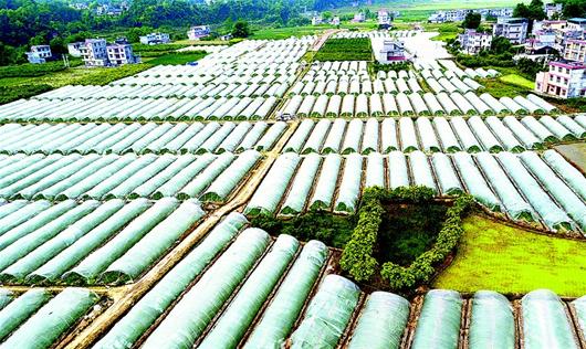 湖北日报讯 昨日,在宣恩县李家河镇金陵寨村航拍的一处西瓜观光采摘园的大棚。宣恩是国家级重点贫困县,山大人稀耕地少。近年来,该县引导企业、合作社、家庭农场等发展设施农业,并通过整合资金对流转农民土地、建设农田设施、发展观光农业和生态农业等予以奖励和补助,促进了农民增收。 (视界网 宋文 摄)