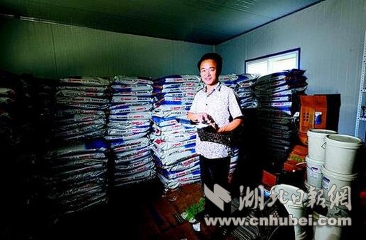 图为2011年,陈志兵在村里专门代理销售鳝鱼饲料,一天到晚在仓库里算账。
