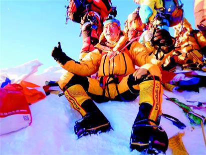 图为:杨险峰成功登顶满脸喜悦