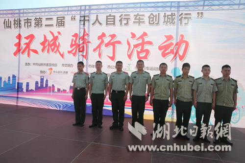 当天早上九时许,千余名骑行爱好者齐聚仙桃市体育广场,用自行车轮丈量城市绿道。参加环城骑行的消防官兵身穿夏季迷彩作训服,车身悬挂“全民消防、共享平安”、“学一点消防知识 添一份平安幸福”等消防知识宣传彩旗,按照行进路线,从仙桃市体育广场出发,贯穿整个主城区,提醒沿街市民关注消防、学习消防。