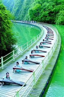 湖北日报讯 28日,孩子们在宣恩县狮子关风景区的漂浮式“水上栈道”上演奏古筝。当日是端午小长假第一天,宣恩县30余名爱好古筝的儿童利用假期,在蜿蜒于青山绿水间的栈道上演奏古筝,既为游客助兴,也用这种方式迎接“六一”儿童节。 (视界网 宋文 摄)