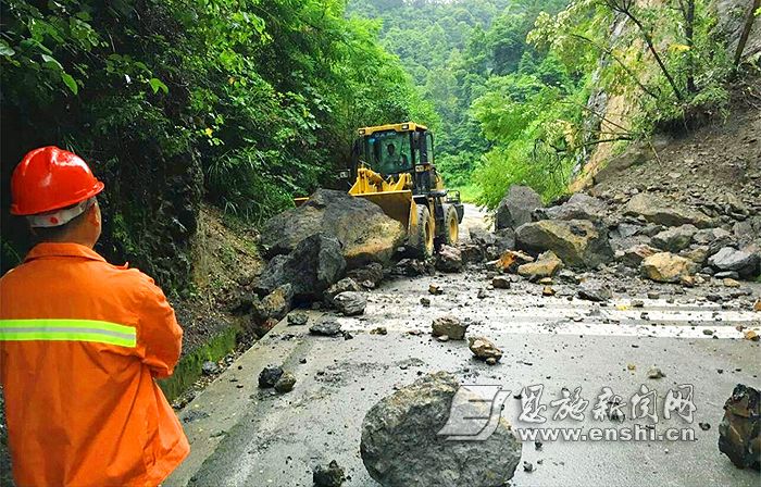受连日暴雨影响,宣恩县境内国省干线出现多处塌方,该县公路部门积极组织抢险人员开展抢险排危保畅工作,确保汛期道路交通安全。(记者 刘亚丽 恩施图片库 王俊 朱俊 摄)